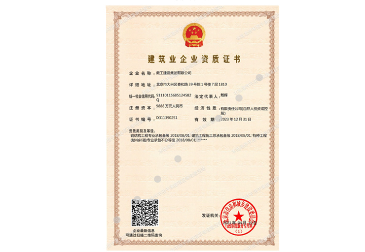 戴工建設集團有限公司,創建于2009年,注冊資本9888萬元人民幣。公司位于北京市大興區。具有建委頒發的建筑裝飾裝修專業壹級,防水保溫工程專業壹級,建筑幕墻專業貳級,消防設施專業貳級,電子與智能化專業貳級,特種工程(結構補強)專業不分等級,建筑機電安裝專業貳級,環保工程專業貳級,鋼結構專業貳級,建筑工程總承包貳級,建筑裝飾工程設計專項甲級,展覽陳列工程設計與施工壹級,展覽展示工程壹級...更多>>